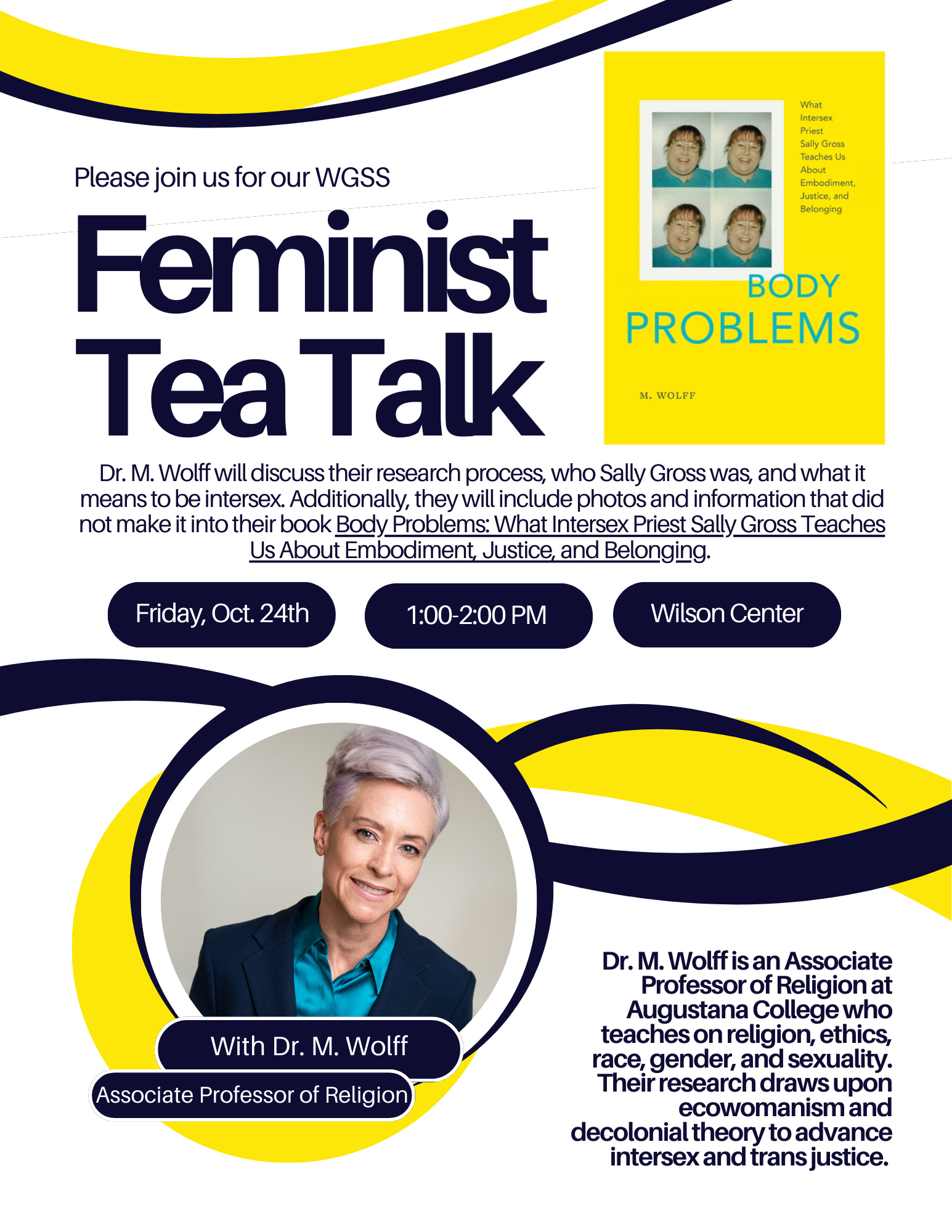 Please join Women, Gender, and Sexuality Studies for a Feminist Tea Talk featuring Dr. M. Wolff on Friday, Oct. 24, from 1-2 p.m., in the Wilson Center. Dr. Wolff will discuss their research process, who Sally Gross was, and what it means to be intersex. Additionally, they will include photos and information that did not make it into their book "Body Problems: What Intersex Priest Sally Gross Teaches Us About Embodiment, Justice, and Belonging."