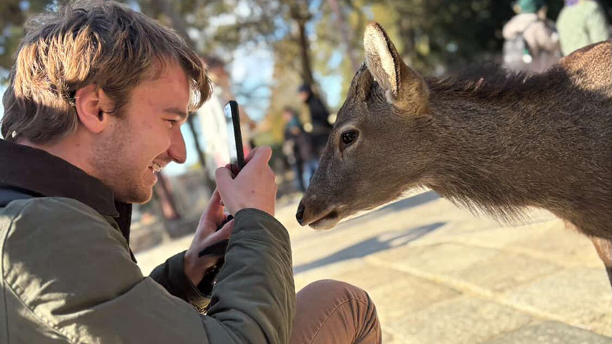 Meet Joshua Traugott, a junior exploring Japan, from Kyoto and Nagano to the bright lights of Tokyo. His favorite moment so far? Petting the famous deer in Nara Park — a dream come true after always wanting to pet the deer on campus at Augie! "Watching hundreds of them surround people for crackers was unforgettable," says Traugott.