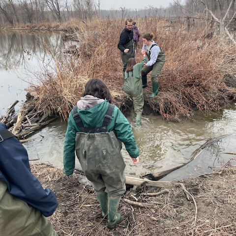 Landowner Tim Pressley '82 gave around 20 Augustana students and faculty a tour of his land in the Milan Bottoms marshes near the site where a 10-acre business development will be constructed. The Upper Mississippi Center is teaming up with the City of Rock Island to do biological and social assessments in order to research the impacts of the development on this landscape and the Quad Cities community, and to help the city formulate a plan to establish a 600 acre preserve. Pictured are Emerson Lehman and John Stofferahn helping Fiona Brady cross an abandoned beaver dam.