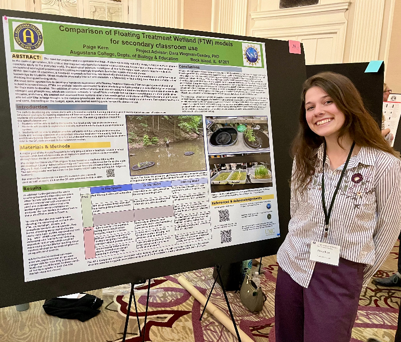 Paige Kern, an Augustana Noyce Grant Scholar, received first place in the STEM Education division for her poster "Comparison of Floating Treatment Wetland (FTW) models for secondary classroom use,'" at the Illinois State Academy of Science annual meeting April 18. Her project was supported by the Noyce Grant and an Augustana Student Research Grant. (An FTW is a "raft" of plants that can be added to a body of water to increase uptake of nutrients like nitrogen and phosphorous.)
