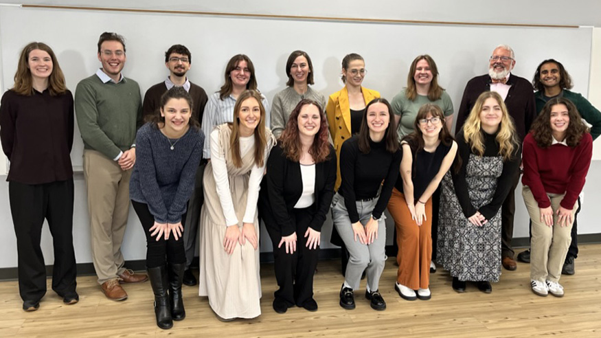 Environmental Studies students and faculty celebrate after their final presentation of senior inquiry projects to City of Davenport staff. This semester's projects centered on the Duck Creek Parkway and included an ecological and trail user perception assessment. (Back, from left: Audrey Bezilla, Graham Hunt, Tom Gruber, Emersen Lehman, Sarah Lashley, Joren Weller-Vanhollebeke, Emily Hoskins, Kevin Geedey, Christian Gonzalez. Front, from left: Kaitlin Troha, Tash Gauerke, Madi Greenwood, Jordyn Van Santen, Gianna Zampogna, Natalie Platt, Angie Truelsen)