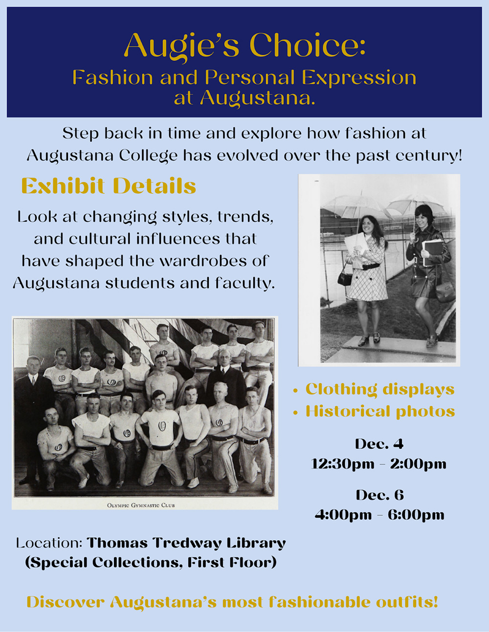 Among those many events is one that the Department of History is co-sponsoring with the Augustana Historical Society … and which would not be possible without the incredible support from the faculty and staff at the Thomas Tredway Library: A Pop-Up Exhibition about the History of Fashion and Clothing at Augustana College!